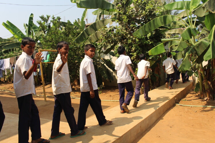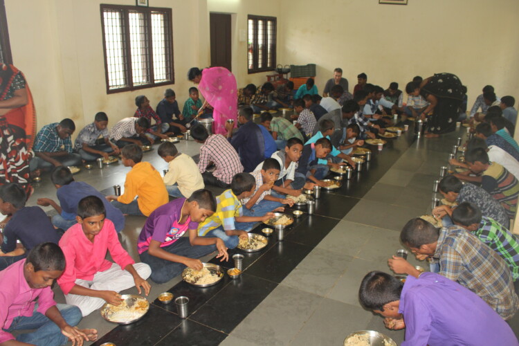 Welcome to Angel Home, located on the outskirts of Rajahmundry in the state of Andhra Pradesh. If you arrive when the boys are playing a game of volleyball on the court just to your left, they will ask you to join them. Chickens are likely scratching in the dirt as the cow munches on banana leaves in the corner. As you get out of the car, the boys may be shy initially, but in no time they will take you by the hand to show you around. There is a beautiful open porch in the front of the U-shaped single-story home where the boys like to play carrom and stage dramas and musical events. The bedrooms, equipped with bunk beds and cubbies, are behind the front porch. On the left are the kitchen, dining room and an apartment for the caretakers of the children. On the right side is a large assembly room used for studying, devotions and indoor group activities. You can imagine how quickly the boys can run from the assembly room across the courtyard to the dining room when they are called for meals. There is no better place to watch the sunset than from the flat rooftop with the evening light shining across the rice fields surrounding Angel Home. The boys also use the rooftop for drying their laundered clothes.